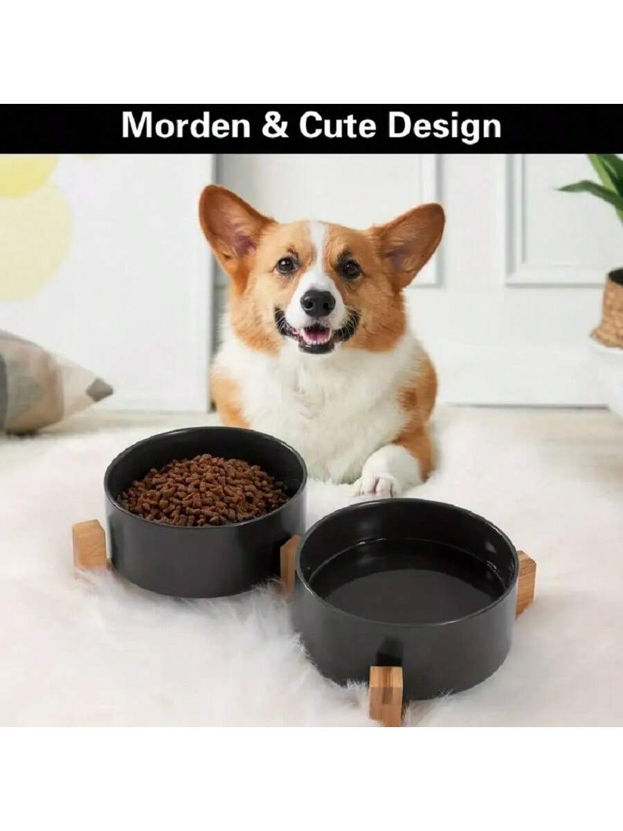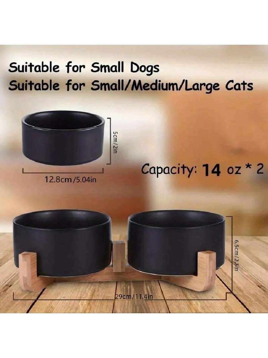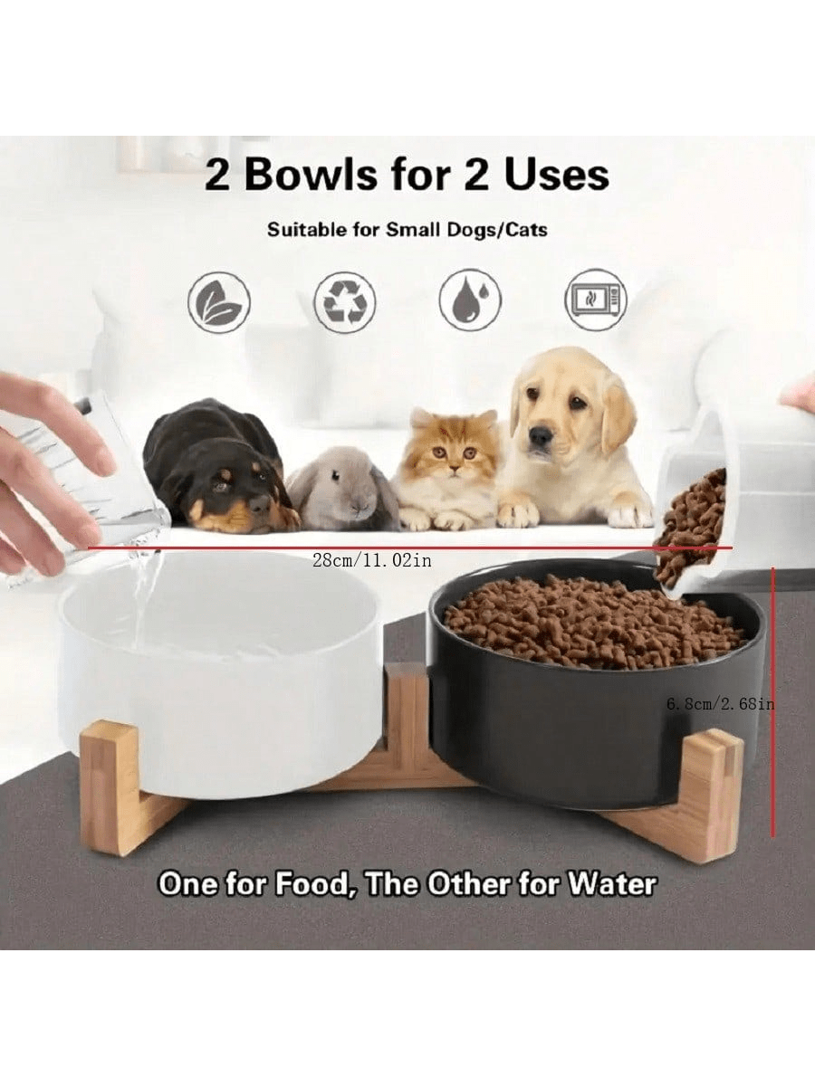 The Ceramic Pet Bowl Set combines ceramic material with a wooden base to create a balanced structure. The bowls are removable, allowing easy cleaning and refilling.