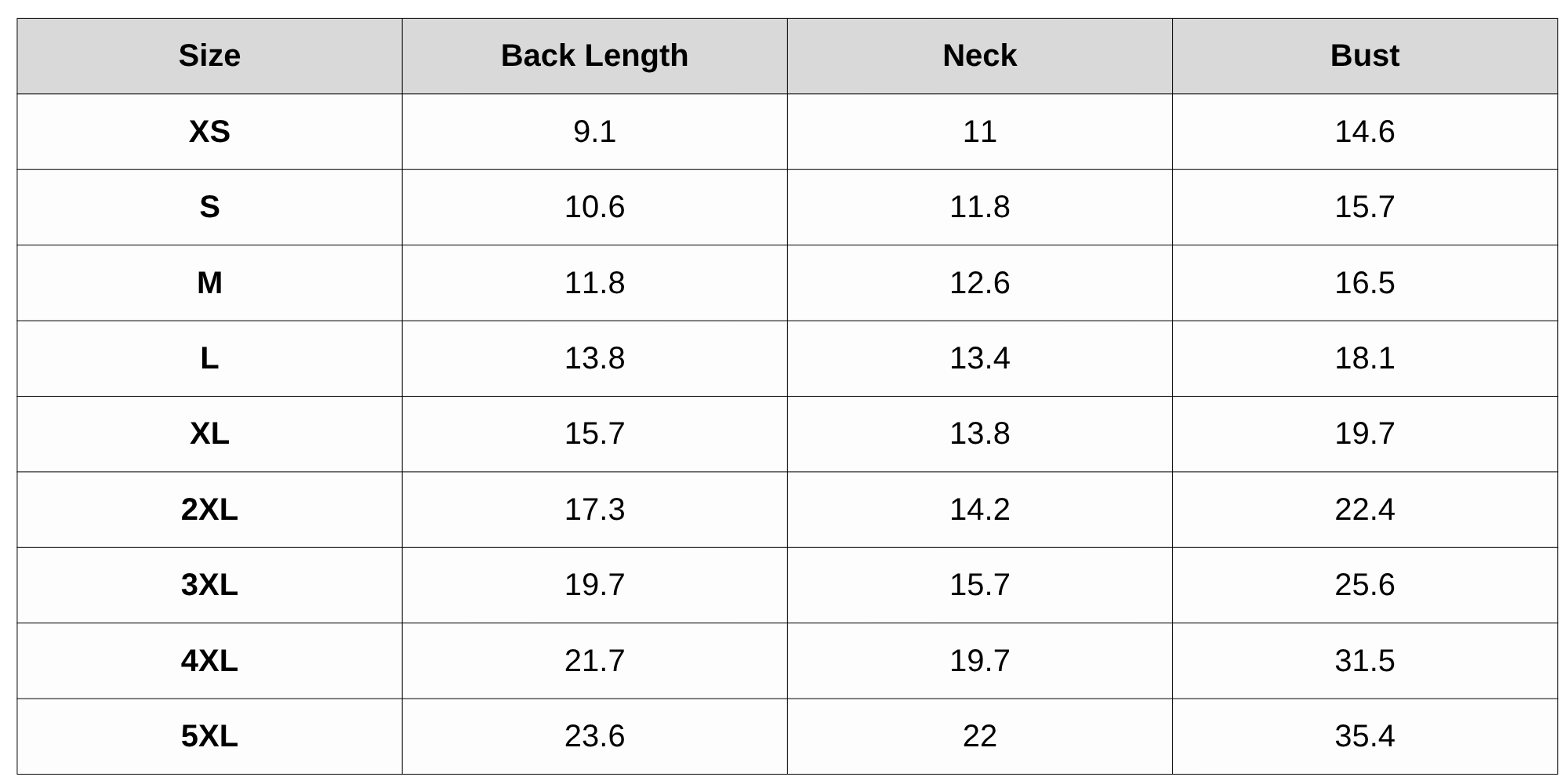 Size Chart(inches);