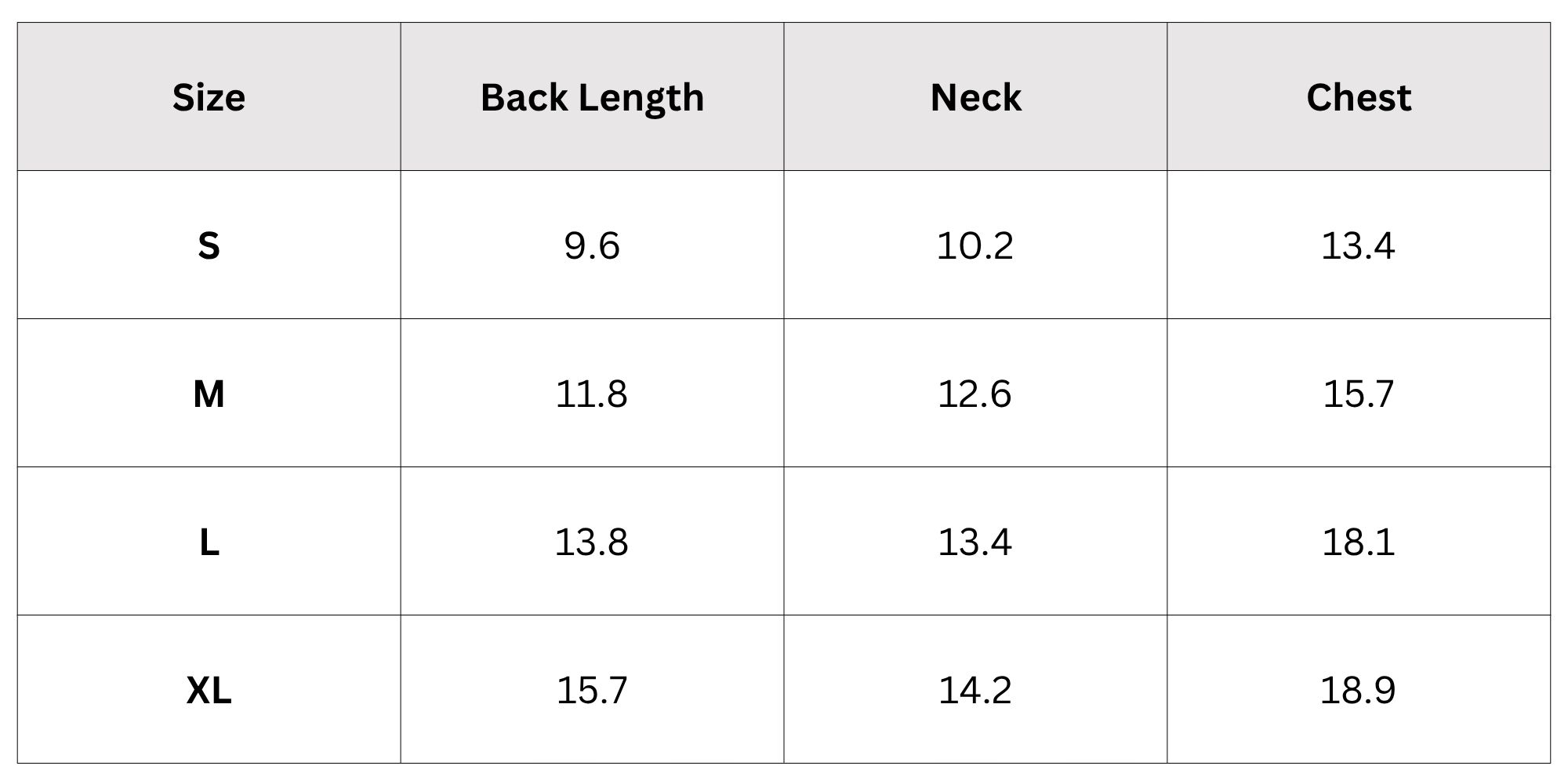 Size Chart (Inches):