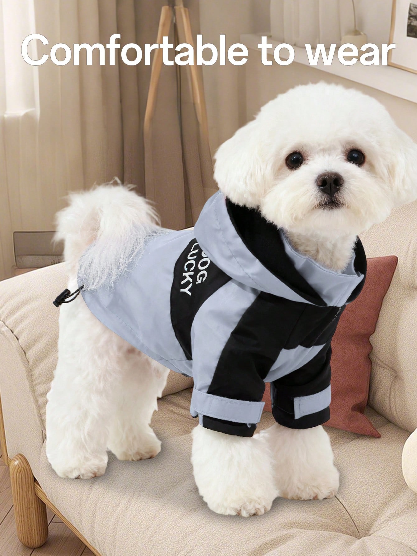 The material used in the Waterproof Dog Raincoat with Hood and Zipper Closure is polyester, which helps reduce the impact of wind and light weather exposure. Its lightweight structure allows easy wear without adding excess weight. The overall design supports consistent use during seasonal transitions such as spring, autumn, and winter.
